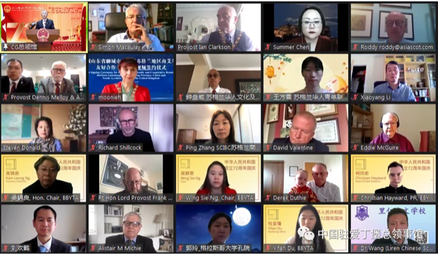 苏格兰政府外事局局长怀特曼、苏格兰议会中国小组主席洛克哈特议员、爱丁堡市市长罗斯等领区政府、议会、市郡、教育、文化、工商界代表,多国驻爱丁堡总领事、苏对华友人、中资机构代表以及当地华侨华人等约120人通过连线方式出席活动。