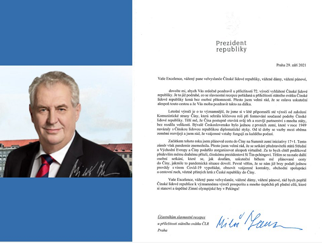 △图为捷克总统泽曼贺信