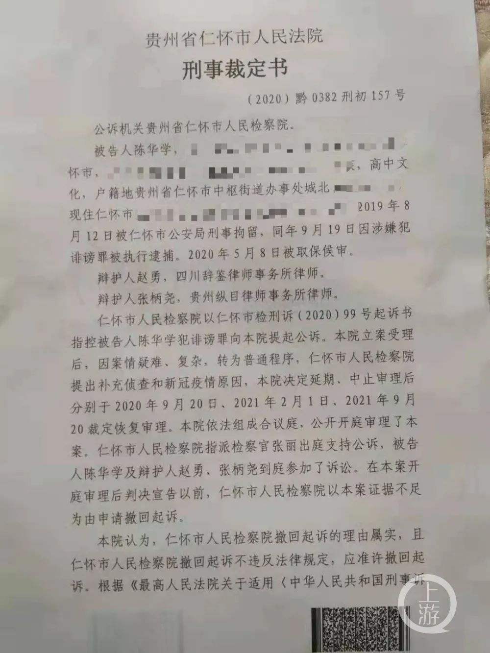 仁怀市人民检察院证实,2019年8月12日陈华学被仁怀警方刑事拘留,同年9月18日被仁怀检方批准逮捕,罪名变更为涉嫌诽谤。