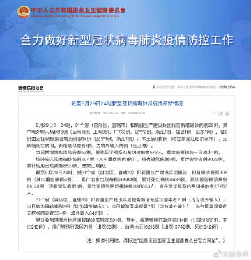 截至9月29日24时,据31个省(自治区、直辖市)和新疆生产建设兵团报告,现有确诊病例908例(其中重症病例4例),累计治愈出院病例90584例,累计死亡病例4636例,累计报告确诊病例96128例,现有疑似病例1例。累计追踪到密切接触者1198043人,尚在医学观察的密切接触者27283人。