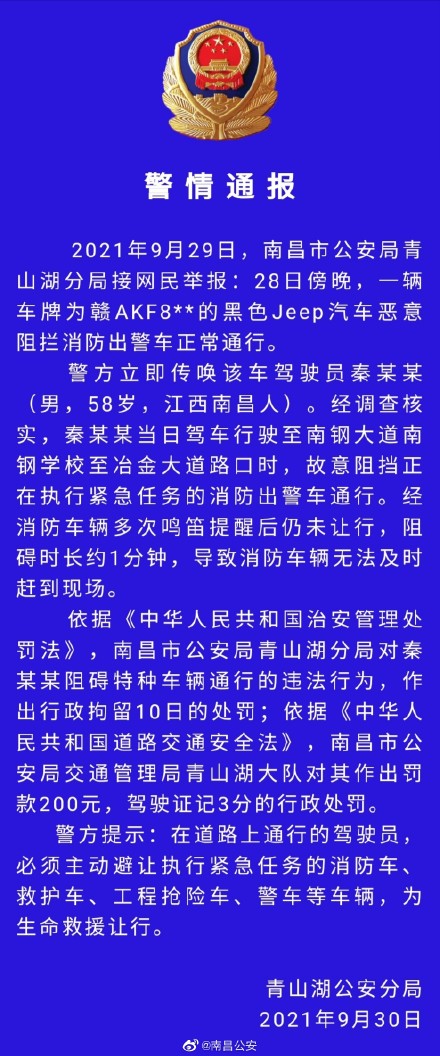 央视网消息:据@南昌公安 微博消息,2021年9月29日,南昌市公安局青山湖分局接网民举报:28日傍晚,一辆车牌为赣AKF8*的黑色Jeep汽车恶意阻拦消防出警车正常通行。
