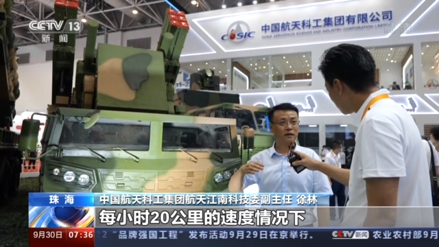 中国航天科工集团航天江南科技委副主任 徐林:这个车具备行进中的作战能力,它可以在不小于每小时20公里的速度情况下,可以探测发现目标,并且发射导弹,或者说用火炮对目标进行有效拦截,所以这套系统又可以要地防御点防御,还可以用于伴随防空。
