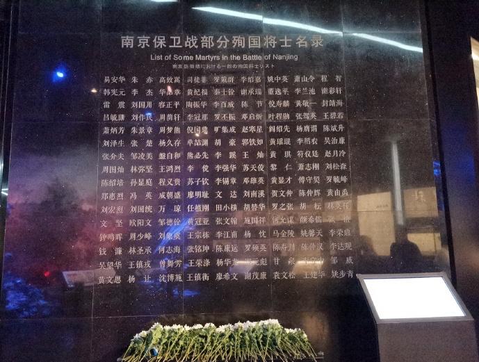 在侵华日军南京大屠杀遇难同胞纪念馆《南京大屠杀史实展》中的一块大理石碑上,镌刻着部分在南京保卫战中殉国的将士名录。由于战争年代条件有限,许多先烈没有留下姓名,但他们的功勋历史不会忘记,祖国和人民更不会忘记!今天,请记住他们的名字!人民英雄永垂不朽!