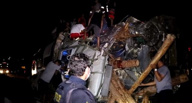 警方监控录像显示,事故发生在当晚20时左右,一辆装载着原木的大型拖车行驶至道路转弯处时,后部拖挂部分脱钩,车体连带原木翻倒,并与对面行驶的一辆公共汽车和面包车连环相撞。拖车司机、公共汽车司机以及1名儿童当场死亡。目前事故已确认12名死者,其余受伤人员在附近医院抢救。(总台记者 汤晔)