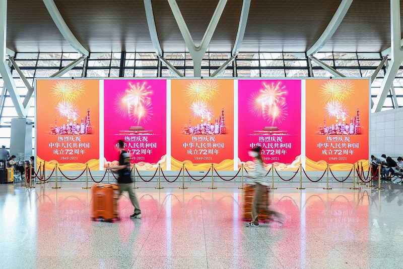 据预测,国庆期间,上海浦东、虹桥机场进出港旅客约160万人次(其中,浦东84万人次,虹桥76万人次),航班量约1.36万架次(其中,浦东8000架次,虹桥5600架次)。节日期间,旅客进出上海两大机场就能感受到浓浓的国庆氛围。在进出两场的高架路上1400面国旗迎风飘扬,两场航站楼醒目位置也布置了各式大型景观以及观赏植物,楼内电子屏滚动播放国庆宣传海报,各服务柜台也都摆放了立式国旗。