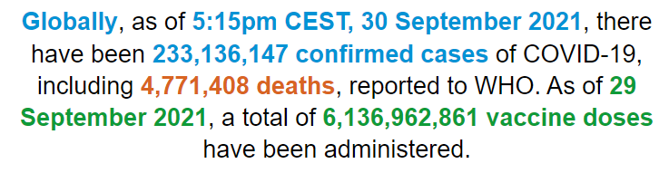 根据世卫组织最新实时统计数据,截至欧洲中部夏令时间9月30日17时15分(北京时间9月30日23时15分),全球累计新冠肺炎确诊病例233136147例,累计死亡病例4771408例。30日全球新增新冠肺炎确诊病例464610例,新增死亡病例8642例。(总台记者 朱赫)