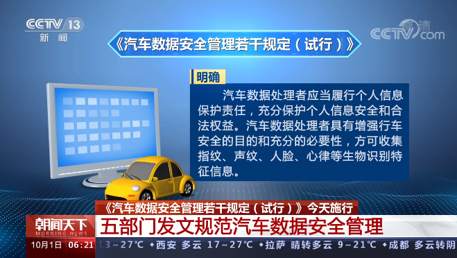 由国家网信办等五部门联合发布的《汽车数据安全管理若干规定(试行)》,今天(10月1日)正式施行。