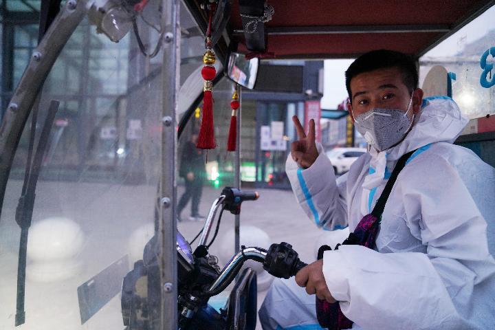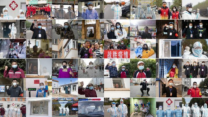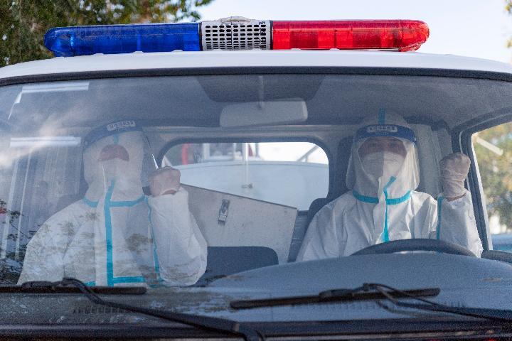 在哈尔滨市巴彦县兴隆镇,哈尔滨市森林消防支队兴隆大队的指战员驾驶车辆对街道进行消杀的间隙比手势加油鼓劲。