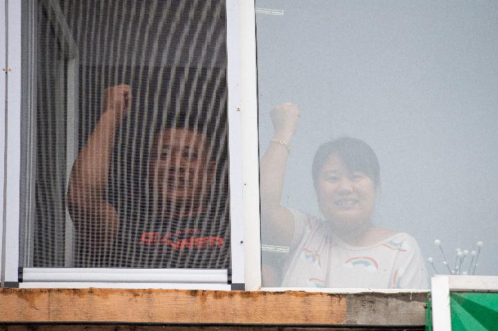 在哈尔滨市巴彦县兴隆镇,居民在家中比手势加油鼓劲。