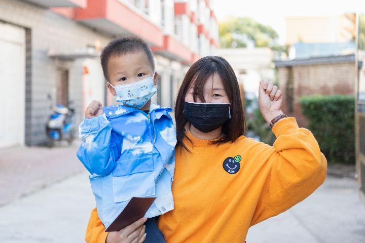 在哈尔滨市巴彦县兴隆镇一处流动核酸检测点外,居民在进行核酸检测采样后比手势加油鼓劲。