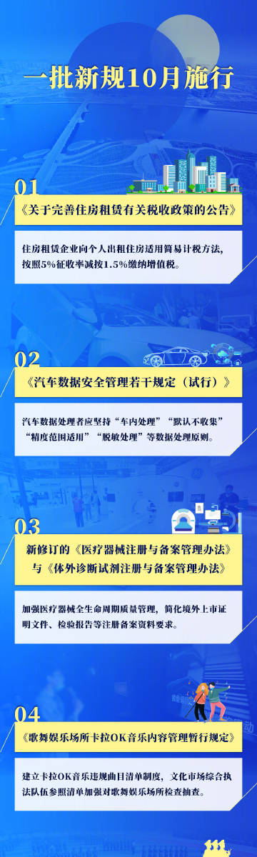 【#权威快报#|#一批新规10月施行#】这些新规10月起施行,转发收藏!从今天起,一批新规开始施行,与你的生活息息相关。①住房租赁市场发展迎来减税优惠政策②汽车数据处理者未经同意不得违规处理用户个人信息③加强医疗器械全生命周期质量管理④建立卡拉OK音乐违规曲目清单制度⑤新修订的兵役法放宽高素质兵员征集年龄限制。哪条你最关心?(记者白阳,海报设计张晨光)