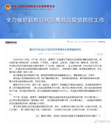 【#9月30日新增确诊病例34例# #9月30日新增本土病例10例#】据国家卫生健康委员会网站,9月30日0—24时,31个省(自治区、直辖市)和新疆生产建设兵团报告新增确诊病例34例。其中境外输入病例24例(云南9例,广东6例,上海5例,北京1例,内蒙古1例,湖南1例,四川1例),含5例由无症状感染者转为确诊病例(广东4例,湖南1例);本土病例10例(均在黑龙江哈尔滨市),含1例由无症状感染者转为确诊病例(在黑龙江)。无新增死亡病例。新增疑似病例2例,均为境外输入病例(均在上海)。