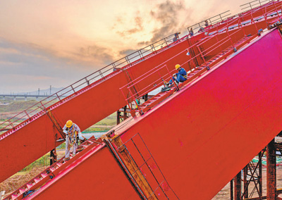 8月20日,安徽省合肥市庐江县,引江济淮G3高速特大桥拱肋顺利合龙。图为8月21日,建设者在施工作业。左学长摄(影像中国)