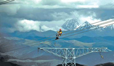 9月29日,我国海拔最高的百万千瓦级水电站——雅砻江两河口水电站首批机组正式投产发电。图为6月17日,两河口水电站500千伏送出工程建设现场,电力工人在高空安装间隔棒。王明峰 刘湘钒摄影报道