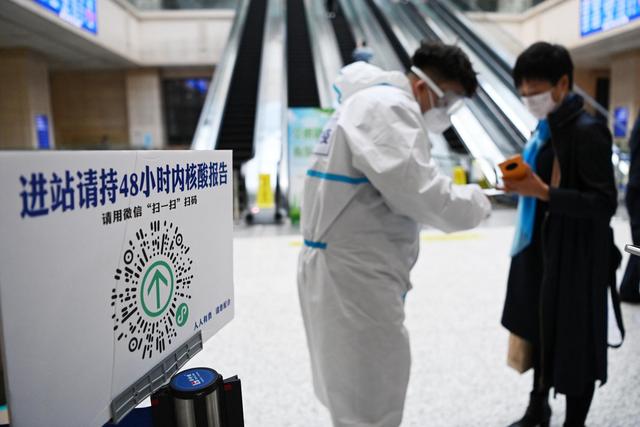 9月23日,在哈尔滨火车站,工作人员(左)在查验旅客核酸检测报告。
