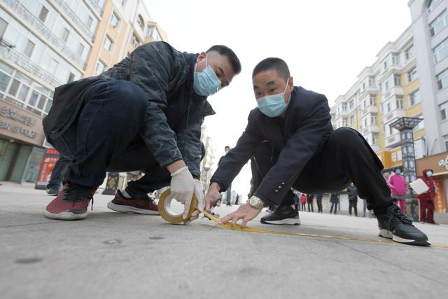 9月25日,在哈尔滨市巴彦县一核酸检测点,工作人员在粘贴排队间隔线。