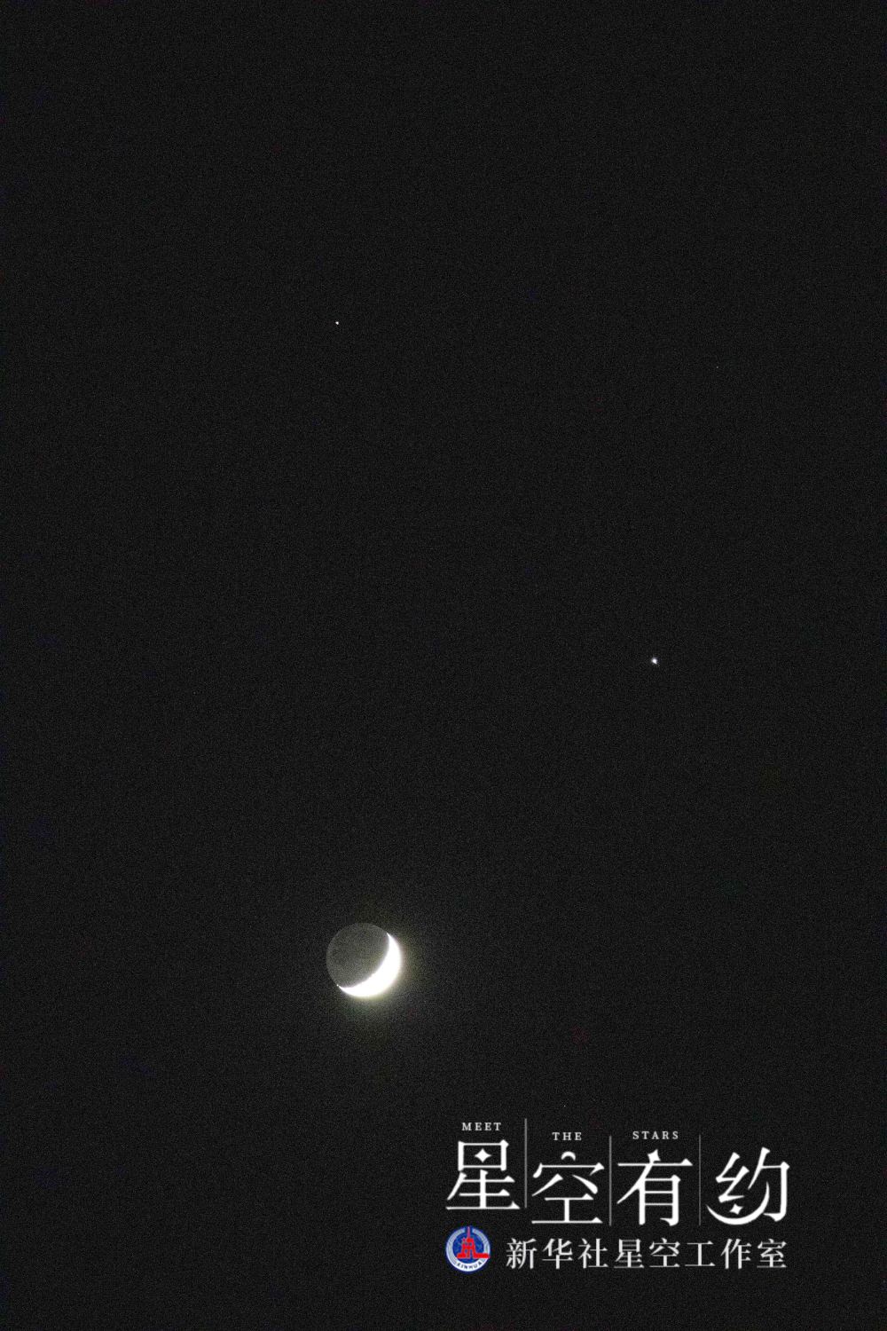 ↑天津市南开中学天文社社员张诣扬2020年3月28日在天津静海区团泊湖拍摄的“金星伴月”。(本人供图)