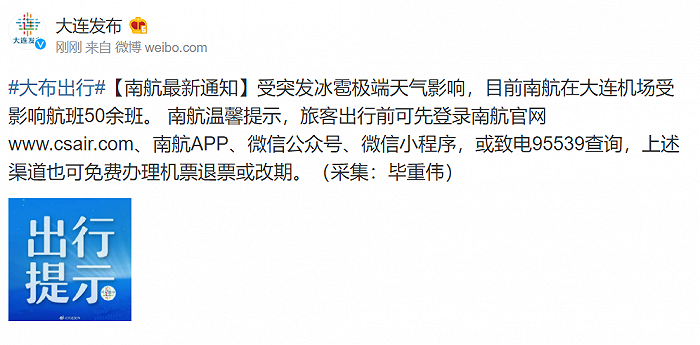 @大连发布 微博10月1日消息,受突发冰雹极端天气影响,目前南航在大连机场受影响航班50余班。 南航温馨提示,旅客出行前可先登录南航官网www.csair.com、南航APP、微信公众号、微信小程序,或致电95539查询,上述渠道也可免费办理机票退票或改期。