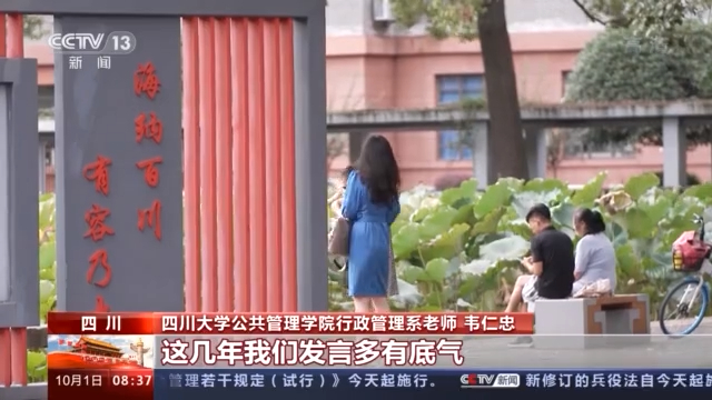 四川大学公共管理学院行政管理系老师 韦仁忠:在我心目中的国就相当于一个大家,如果国家不强大的话,那一个小的家庭再强大有什么用,一个国家强大了,我们国民腰杆子也直了,经济地位,包括政治地位。你看这几年我们发言多有底气,在国际上有话语权,不管是在科技还是在经济各方面交流交往,还是文化交往过程中,我们也是腰杆子很直的,觉得很自豪。