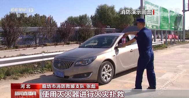 廊坊市消防救援支队 张彪:车辆行驶过程中如果发现有冒烟或者发生火灾这种情况,应将汽车立即停在路边进行熄火,使用灭火器进行火灾扑救;如果是汽车前机盖着火的话,就缓慢打开前机盖,如果氧气迅速进入前机盖的话会使火焰迅速蔓延,对我们自身造成灼伤;如果火焰蔓延较大,应该立即撤离起火区域并拨打119报警。