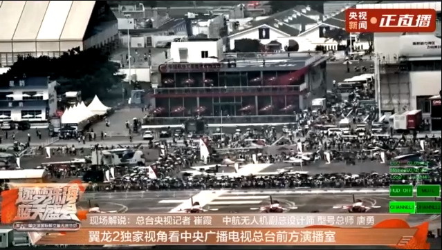 翼龙2察打型无人机携带光电吊舱和合成孔径雷达,7个外挂点满载多型导弹、炸弹和任务吊舱,按预定规划自主驶入跑道,自主起飞,完成爬升和转弯后,进行低空通场飞行表演,机头下方的高清光电吊舱同步拍摄航展现场,并实时将视频信号传输至现场展示大屏,以独特视角将航展盛况实时呈现给现场观众。