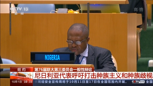 当地时间9月30日,在中国和非洲国家共同倡议下,尼日利亚代表78国在第76届联合国大会第三委员会,也就是社会、人道主义和文化委员会 一般性辩论中发言,对种族歧视、警察暴力、社会不平等现象表示严重关切,呼吁加快落实《德班宣言和行动纲领》,打击一切形式的种族主义、种族歧视、排外和相关不容忍行为。