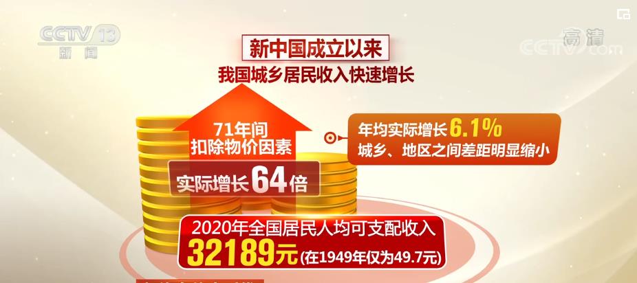 新中国成立以来,我国城乡居民收入快速增长,2020年全国居民人均可支配收入达到32189元,这一数字在1949年仅为49.7元。71年间,扣除物价因素实际增长了64倍,年均实际增长6.1%,城乡、地区之间差距明显缩小。