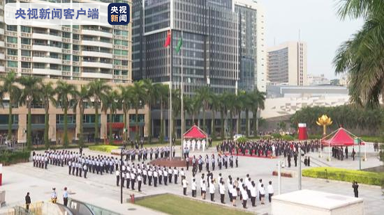 上午8时整,升旗仪式在金莲花广场举行。澳门特区政府、立法及司法机关负责人,中央人民政府驻澳机构代表,以及澳门社会各界人士约100人一同观礼。随着《义勇军进行曲》响起,全场肃立,注视着五星红旗和澳门特区区旗冉冉升起。