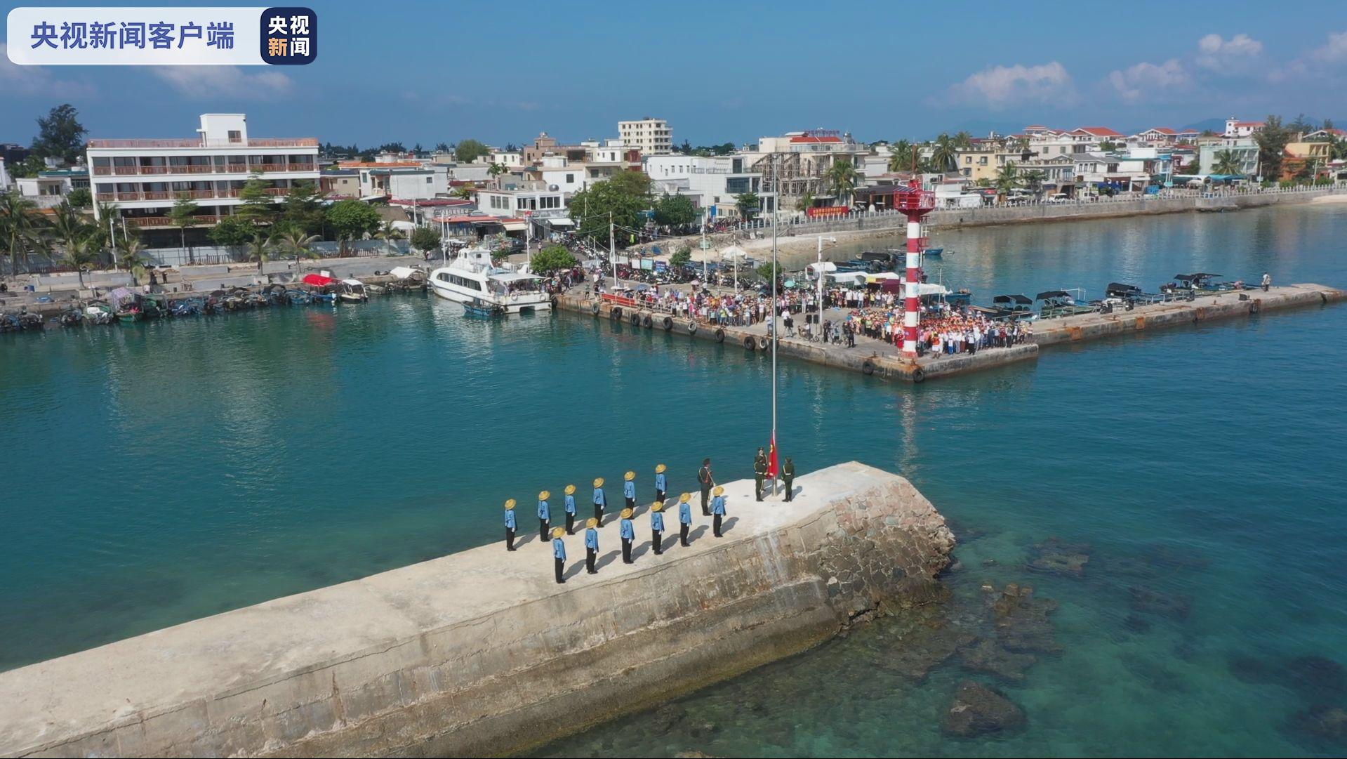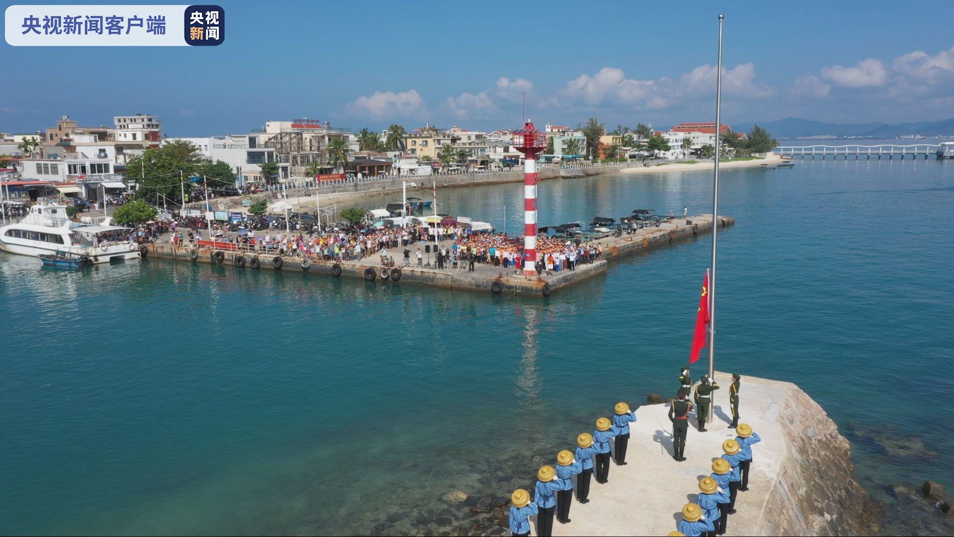 随着嘹亮的国歌声在三亚西岛渔村码头响起,从西岛民兵和渔村村民中严格筛选出来的15名女性国旗护卫队成员,在防坡堤最前方将五星红旗缓缓升起,防坡堤对岸码头上的渔民、少先队员和警察以及游客们列成方队向国旗敬礼,湛蓝色海面上飘扬的五星红旗格外引人注目。