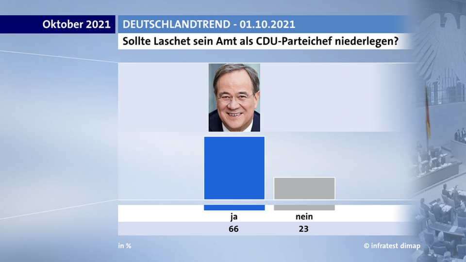 根据德国电视一台当地时间10月1日发布的最新一期“德国趋势”民意调查结果, 66%的受访民众认为,在由基民盟及其姊妹党基社盟组成的联盟党支持率降至历史新低之后,联盟党总理候选人拉舍特应该辞去基民盟主席一职。甚至在联盟党的支持者之中,也有60%左右的人认为拉舍特应该辞职。