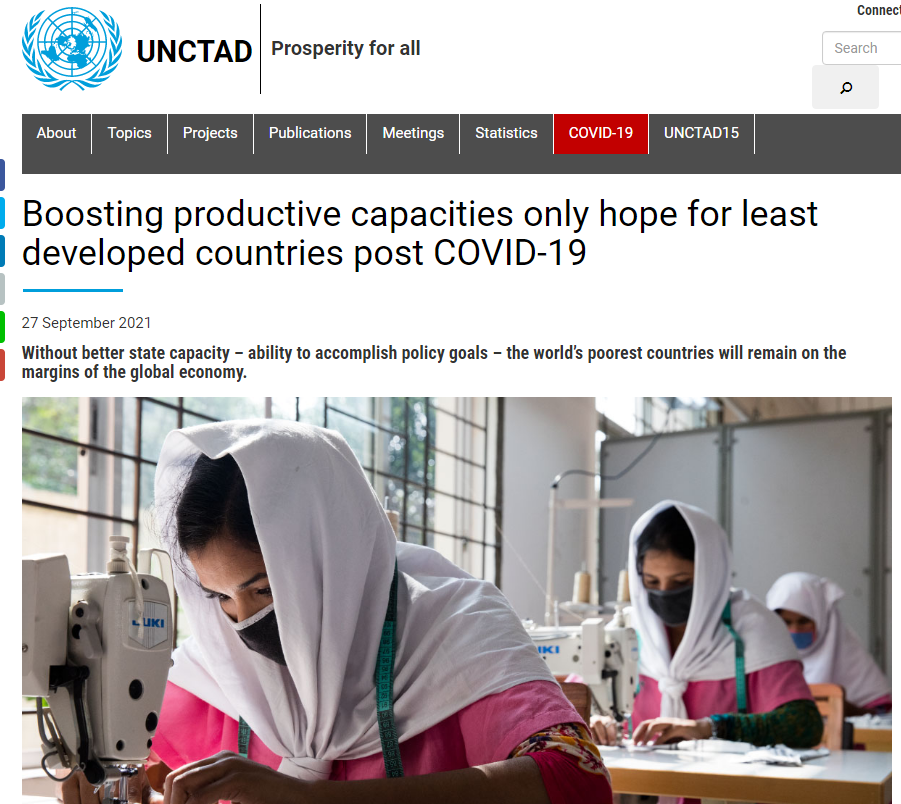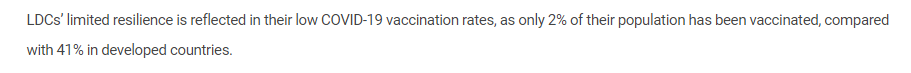 根据联合国贸易和发展会议9月27日发布的《2021年最不发达国家报告》,全球共有46个最不发达国家,这些国家的新冠疫苗接种率较低,仅有2%的人口接种了疫苗,而发达国家这一数字为41%。