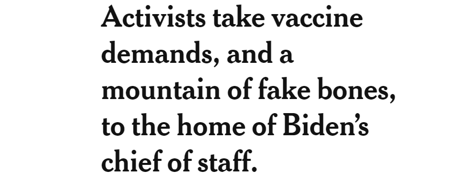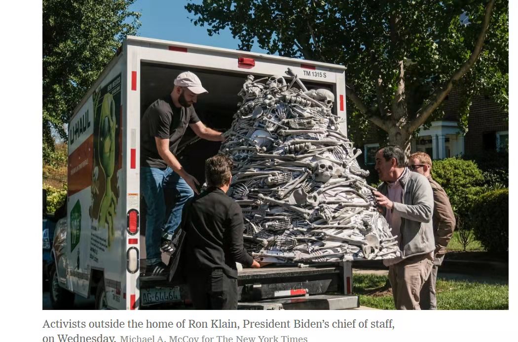 抗议者在现场堆放了一座人造骨头堆,象征着拜登政府和美国制药巨头在帮助全球扩大疫苗生产能力方面的自私自利、不作为让数百万人失去本不该失去的生命。
