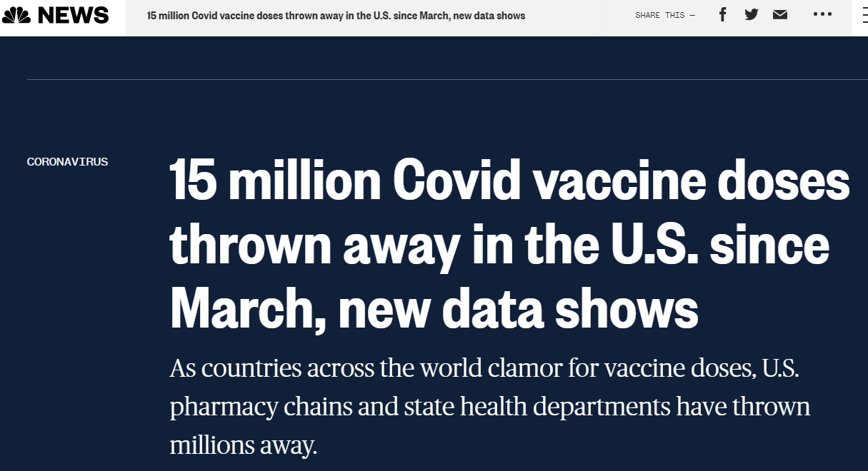 △美国全国广播公司网站报道称,自3月以来,美国丢弃了1500万剂新冠疫苗
