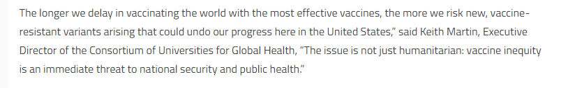 全球卫生大学联合会执行主任基思·马丁也说,“我们将最有效疫苗提供给全世界接种的时间拖得越长,就越有可能出现新的、抗疫苗的变种,这可能会破坏我们在美国取得的进展”,“这个问题不仅仅是人道主义问题:疫苗不平等是对国家安全和公共卫生的直接威胁”。