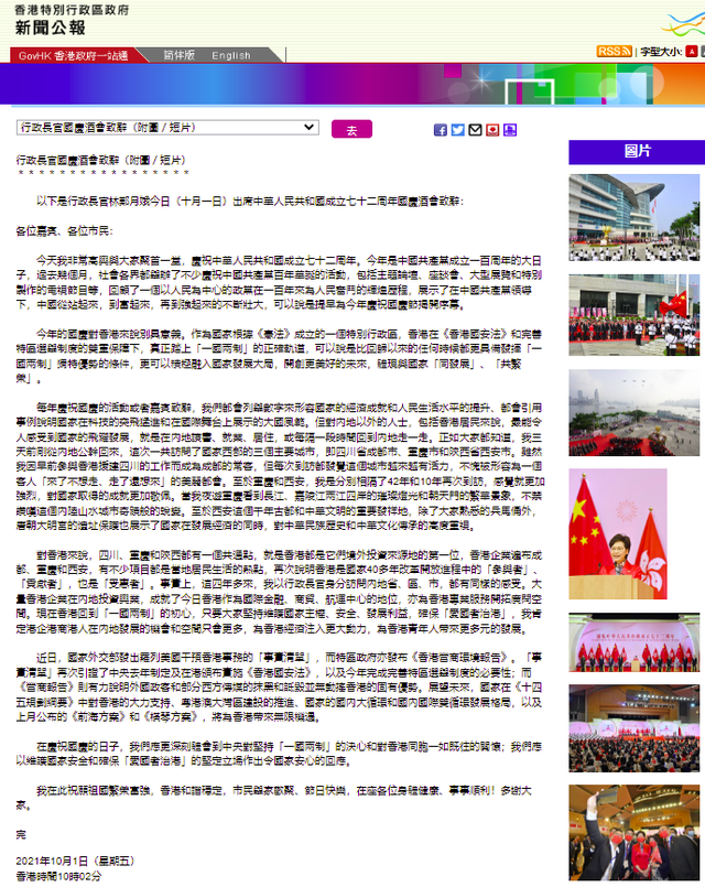 林郑月娥说,今年的国庆对香港来说别具意义。香港在香港国安法和完善特区选举制度的双重保障下,真正踏上“一国两制”的正确轨道,可以说是比回归以来的任何时候都更具备发挥“一国两制”独特优势的条件,更可以积极融入国家发展大局,开创更美好的未来,体现与国家“同发展”“共繁荣”。