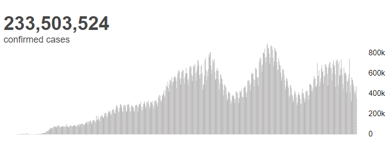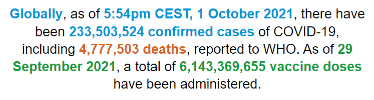 根据世界卫生组织最新实时统计数据,截至欧洲中部夏令时间10月1日17时54分(北京时间10月1日23时54分),全球累计新冠肺炎确诊病例达233503524例,累计死亡病例4777503例。