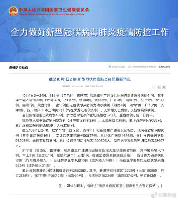 截至10月1日24时,据31个省(自治区、直辖市)和新疆生产建设兵团报告,现有确诊病例890例(其中重症病例4例),累计治愈出院病例90677例,累计死亡病例4636例,累计报告确诊病例96203例,无现有疑似病例。累计追踪到密切接触者1200303人,尚在医学观察的密切接触者28697人。