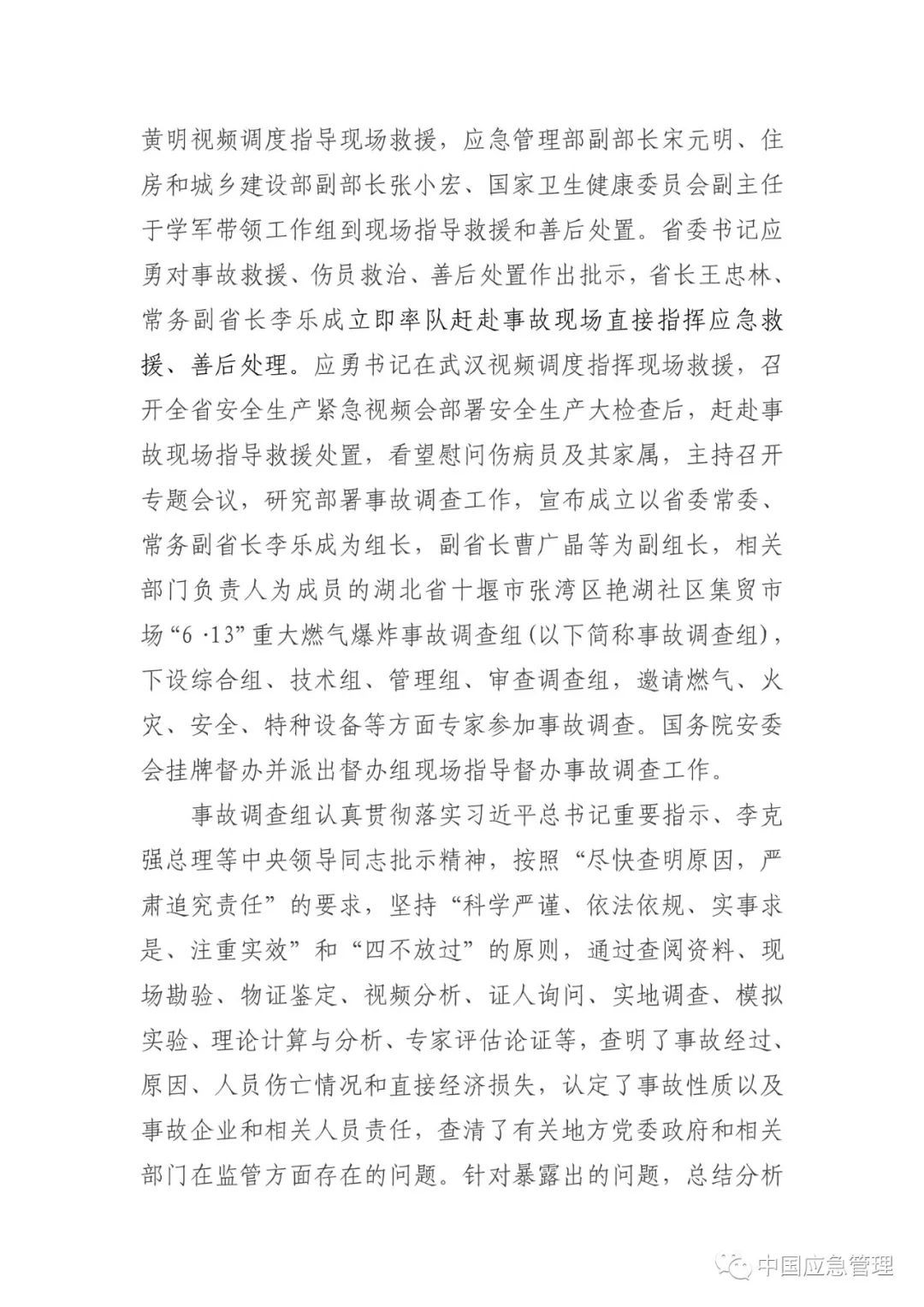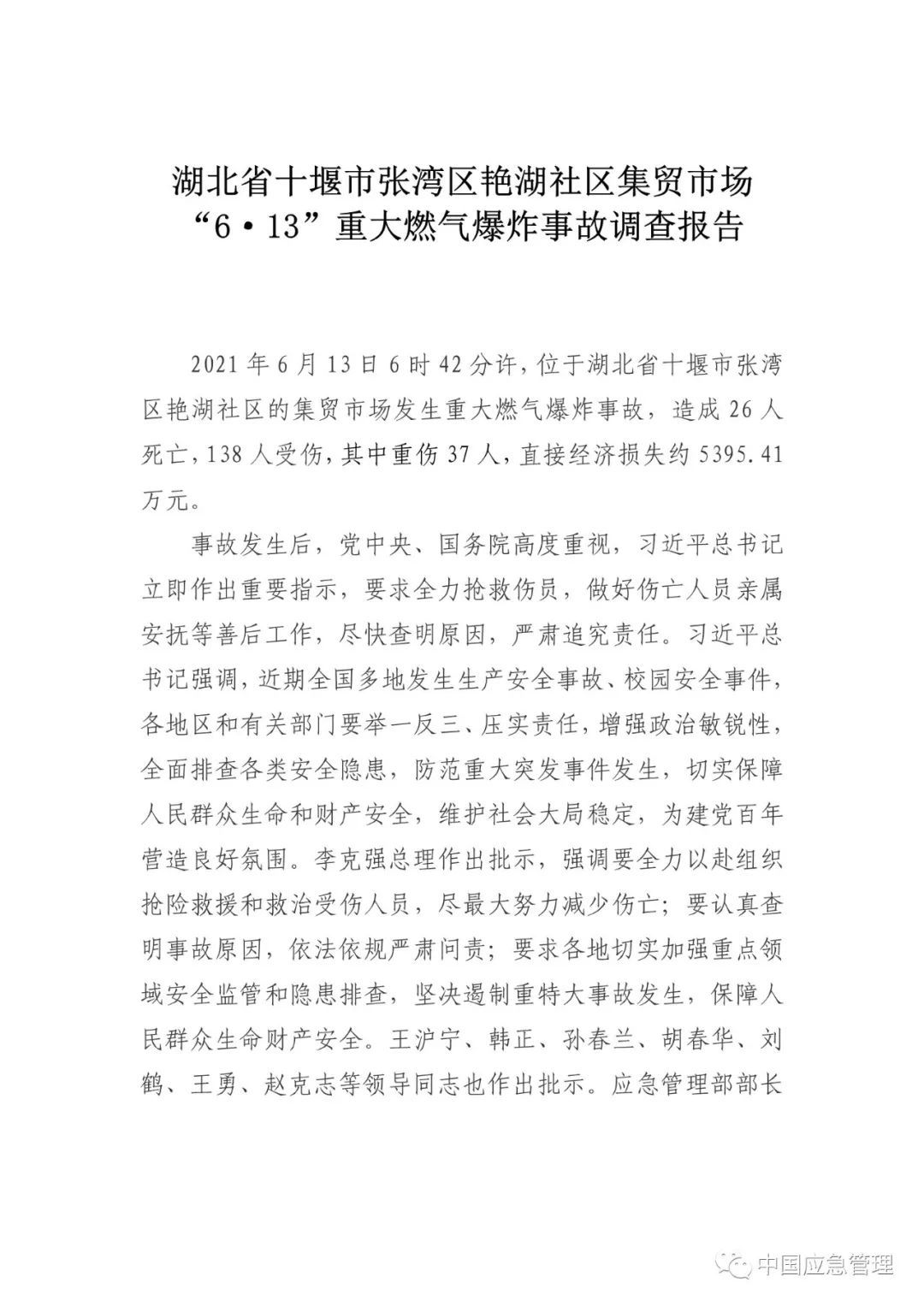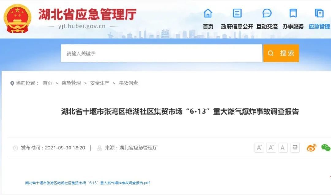9月30日,湖北省应急管理厅官方网站发布了《湖北省十堰市张湾区艳湖社区集贸市场“6·13”重大燃气爆炸事故调查报告》,事故调查组认定,这起重大燃气爆炸事故是一起重大生产安全责任事故。