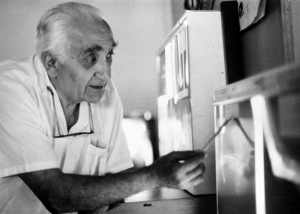 1980年,马海德大夫在北京阜外医院看X光片。新华社发