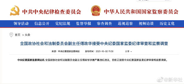 【全国政协社会和法制委员会副主任#傅政华接受审查调查#】据中央纪委国家监委网站消息:全国政协社会和法制委员会副主任傅政华涉嫌严重违纪违法,目前正接受中央纪委国家监委纪律审查和监察调查。