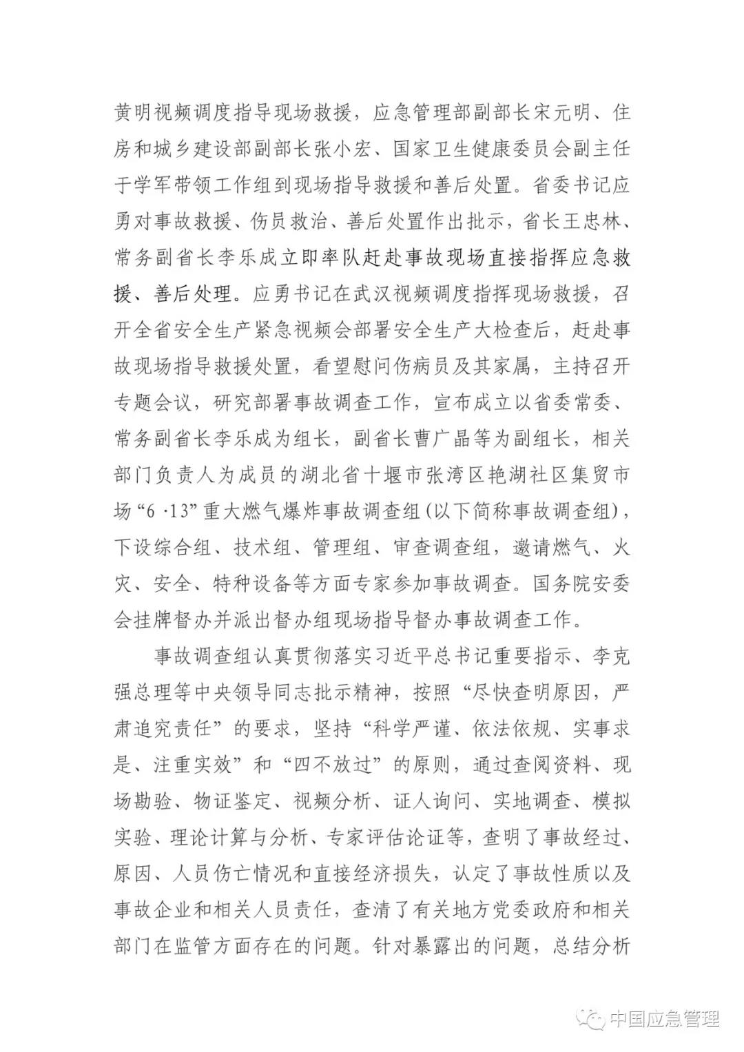 9月30日,湖北省应急管理厅官方网站发布了《湖北省十堰市张湾区艳湖社区集贸市场“6·13”重大燃气爆炸事故调查报告》,认定该事故是一起重大生产安全责任事故。