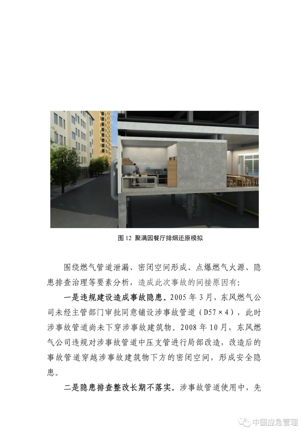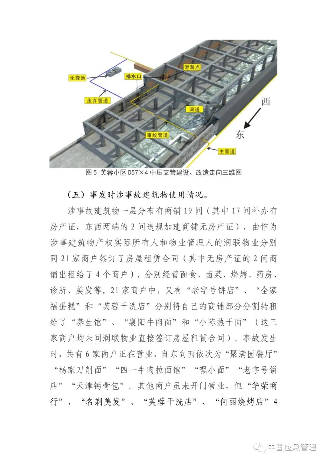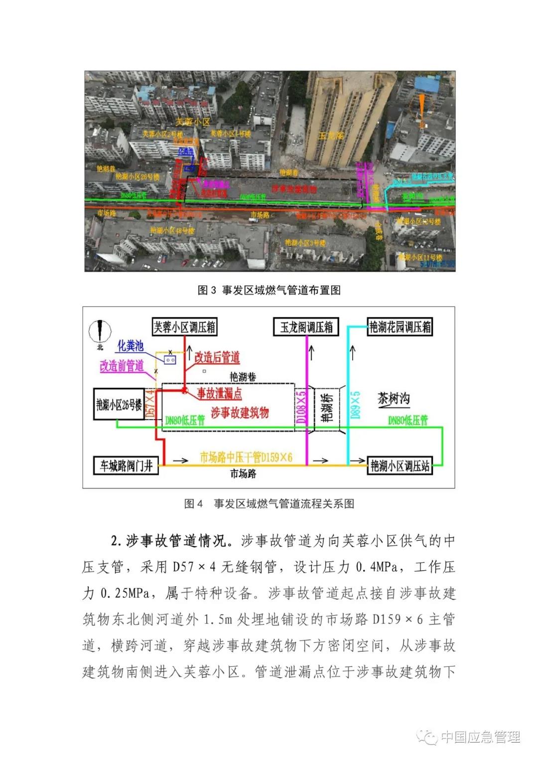 事故直接原因为天然气中压钢管严重锈蚀破裂,泄漏的天然气在建筑物下方河道内密闭空间聚集,遇餐饮商户排油烟管道排出的火星发生爆炸。