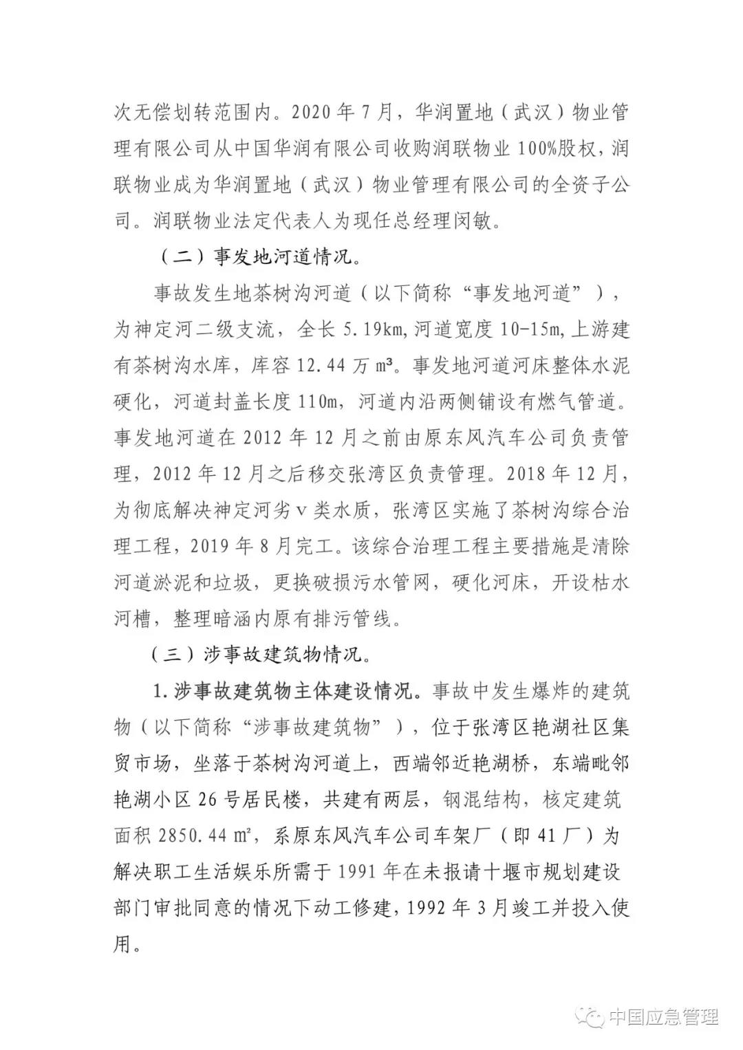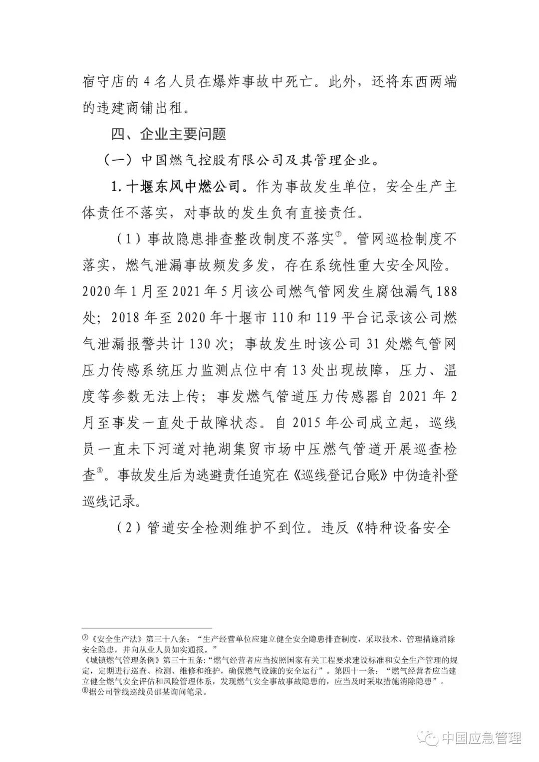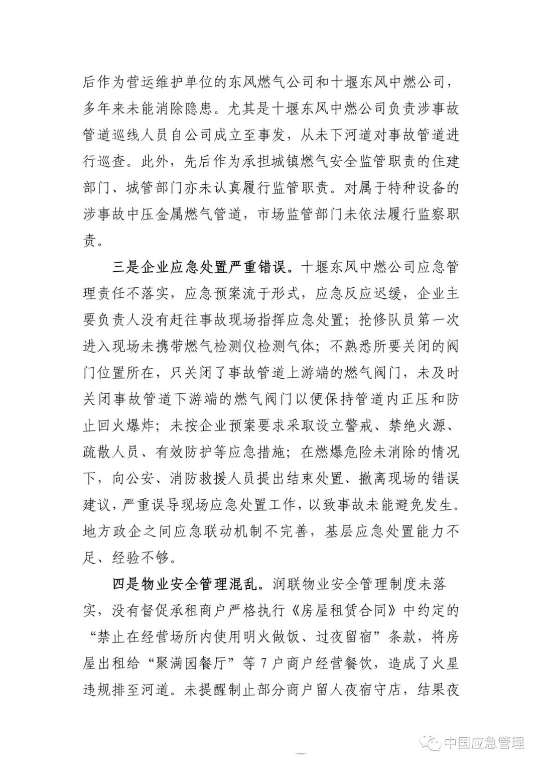 调查报告显示,涉事故建筑物由东风汽车房地产有限公司向润联物业划转时,未提示或告知下方有燃气管道穿过,其中现在负责运营维护事故管道的十堰东风中燃公司,从未对事故管道进行巡查,事发后巡线员为逃避责任追究,伪造补登了巡线记录。