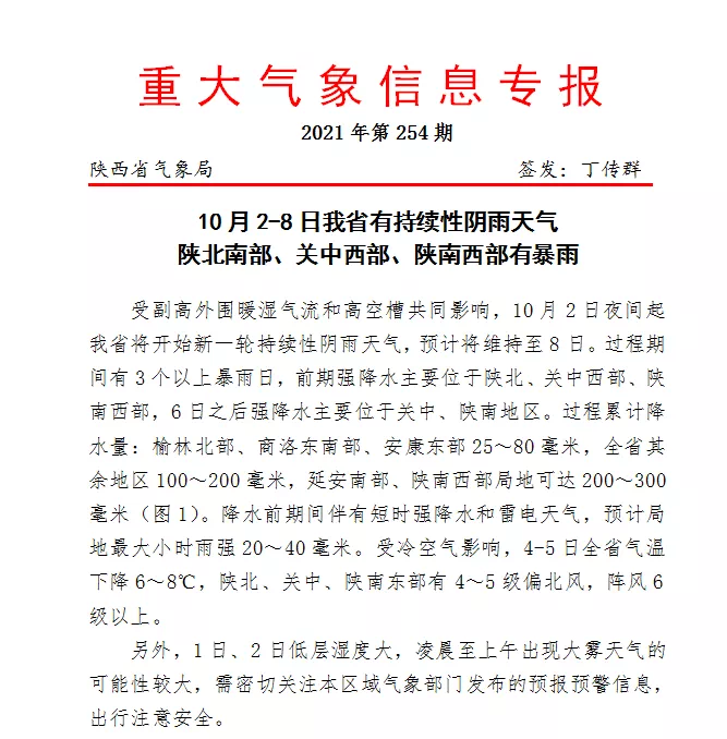 陕西省气象台发布重大气象信息专报,10月2日—8日,陕西省有持续性阴雨天气,陕北南部、关中西部、陕南西部有暴雨。