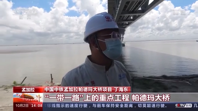 中国中铁孟加拉国帕德玛大桥项目 丁海东:大家好,我叫丁海东,下面带大家来看一下“一带一路”上的重点工程——帕德玛大桥。帕德玛大桥上层是双向四车道公路,下层为单线米轨铁路,目前全桥钢梁已经合龙。帕德玛大桥不仅(将)结束帕德玛河两岸的居民千百年来靠摆渡往来的历史,还将孟加拉国南部21个区同首都达卡连接起来,为孟加拉国带来每年1.5%的GDP增长。我作为一个建设者与记录者,见证着梦想之桥克服重重困难从无到有。于我个人而言是非常幸运的,背靠强大的祖国,在如此大的平台上施展自己的抱负。