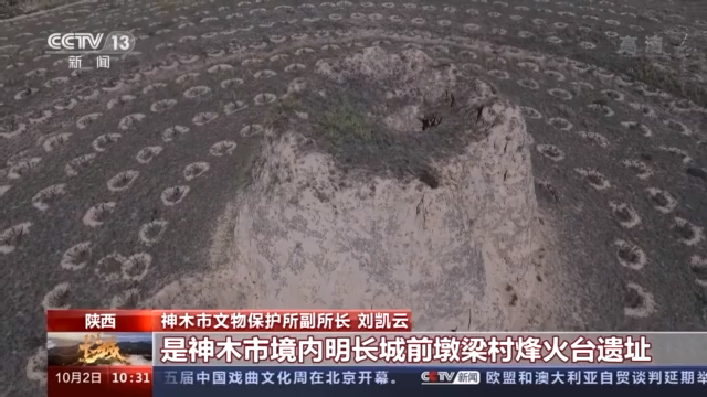 陕西神木市文物保护所副所长 刘凯云:神木市境内的明长城前墩梁村烽火台遗址,与大部分方形墩台不同,这个烽火台呈圆形,外部未包砖,而且少见地出现了在下方开有八个洞口,里面是环形通道。从这个遗存上看,可能底部洞口会有通往顶部的台阶。不过,我特别想说的是,也是值得关注的是,这个烽火台与距今4000多年的石峁遗址似乎遥相呼应着。