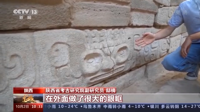 陕西省考古研究院副研究员 邸楠:石雕是和三星堆的青铜面具有一定的相似之处,但是石峁的年代是比较早的,两者之间相差了六七百年,石峁的这件石雕,在外面做了很大的眼眶,在三星堆的青铜面具上,它重点表现的也是眼睛,体现了对眼睛的一个崇拜。