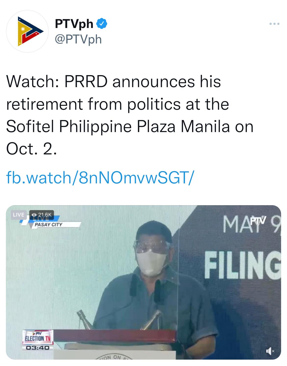 当地时间10月2日下午,据菲律宾国家电视台PTV报道,该国总统杜特尔特在陪同参议员克里斯托弗·吴提交副总统候选人资格证书后发表讲话称,他祝福克里斯托弗·吴能够在副总统选举中获得好运。杜特尔特同时宣称:“我将从今天开始从政治生涯中退休。”
