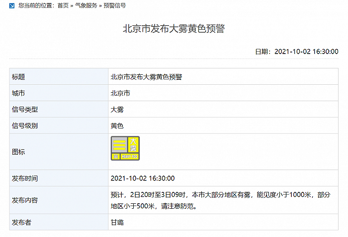 北京发布大雾黄色预警,部分地区能见度将小于500米