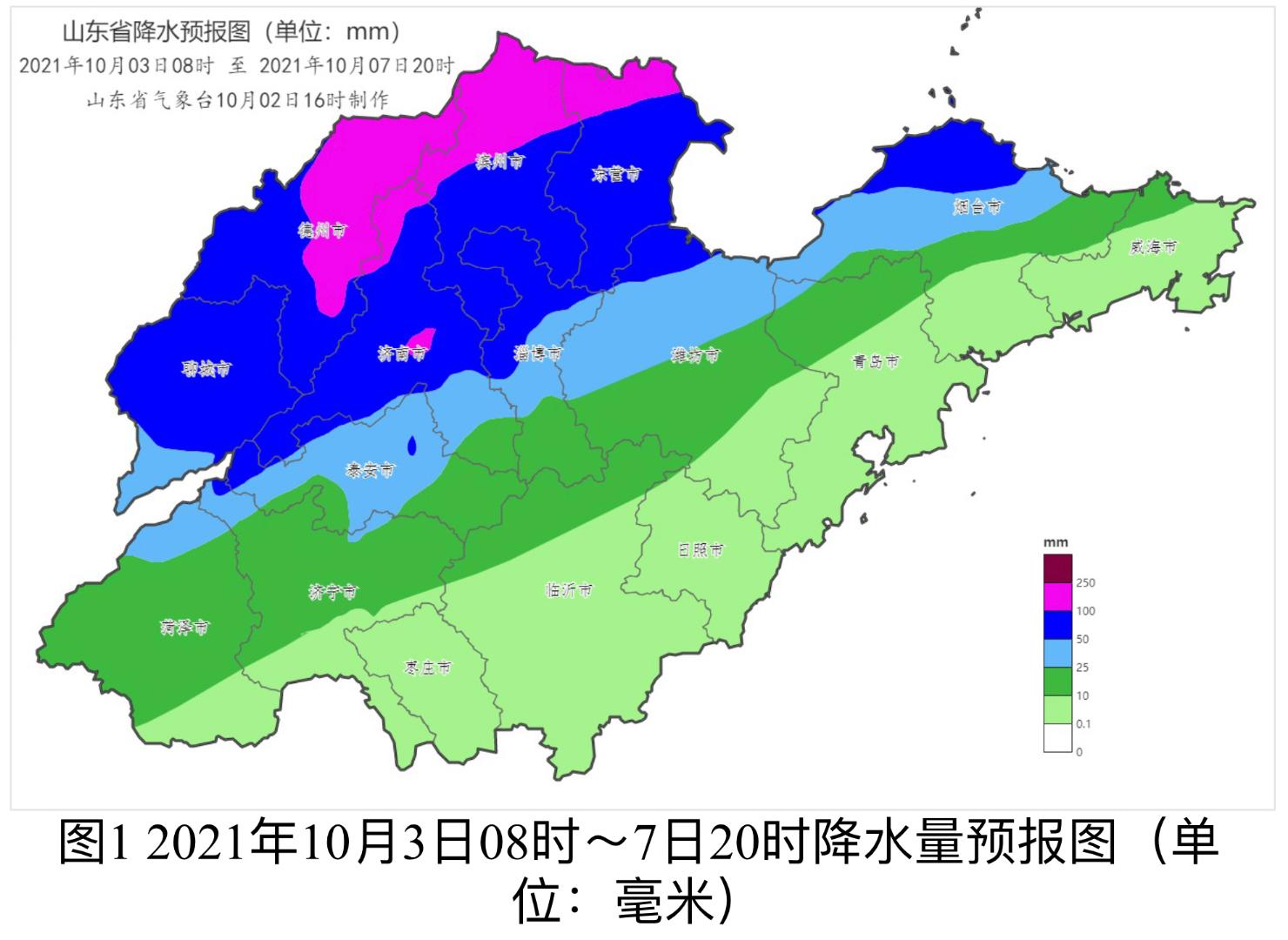 10月2日,总台央视记者在山东省气象台了解到,受副热带高压边缘暖湿气流影响,预计3日白天至7日,山东省自西向东有一次明显降雨天气过程,主要降水时段在3日白天至4日夜间。山东省累积平均降水量30~50毫米,其中,聊城、德州、滨州、东营、济南、淄博北部和烟台北部50~70毫米局部100毫米以上;泰安、淄博南部和潍坊北部20~40毫米局部50毫米以上;其他地区5~20毫米。1小时最大降水量30~50毫米。